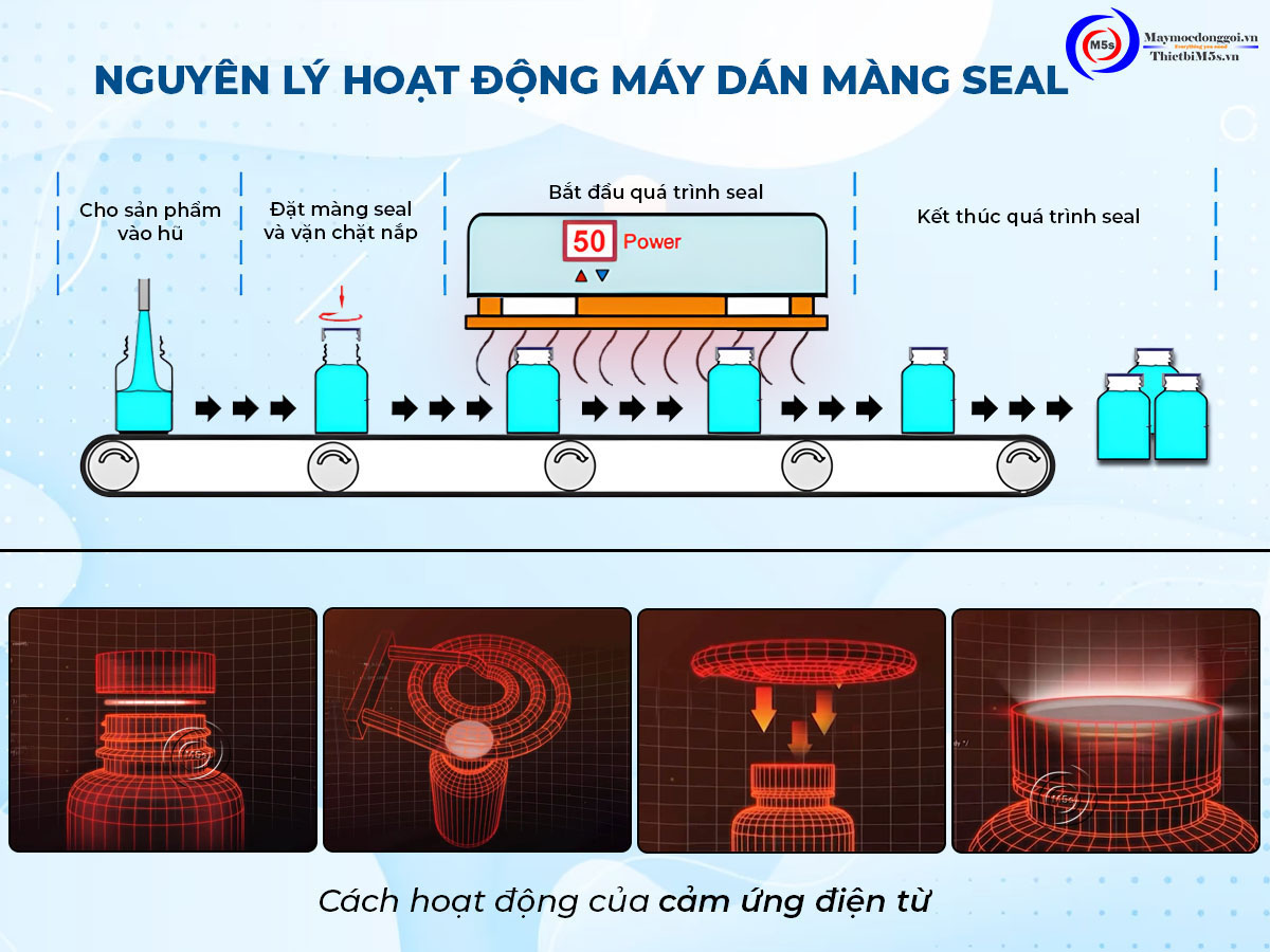 Nguyên lý hoạt động máy dán màng seal: Máy siêu màng nhôm nắp chai sử dụng nguyên lý cảm ứng điện từ để dán màng siu nhôm vào miệng chai nhựa một cách chắc chắn. Đầu tiên, người dùng cần cho màng nhôm vào nắp chai sau đó vặn chặt. Tiếp đến để chai lọ vào phần cảm ứng điện từ. Dòng điện sẽ đi qua và làm nóng lớp keo của màng siu và bám chặt vào miệng chai chỉ trong vài giây.