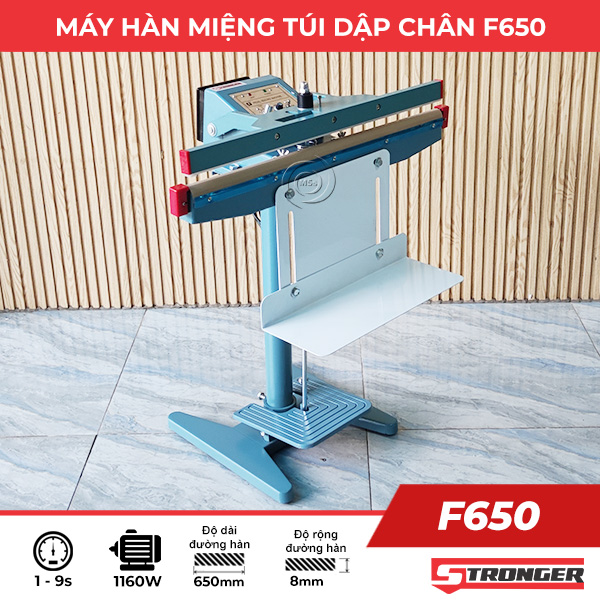 Máy dán miệng túi dập chân F-650 hoạt động mạnh mẽ với công suất 1050W giúp đảm bảo các mối hàn được kín khít với độ dày bao bì từ 5mm đến 15mm nhanh chóng và đạt hiệu quả cao.