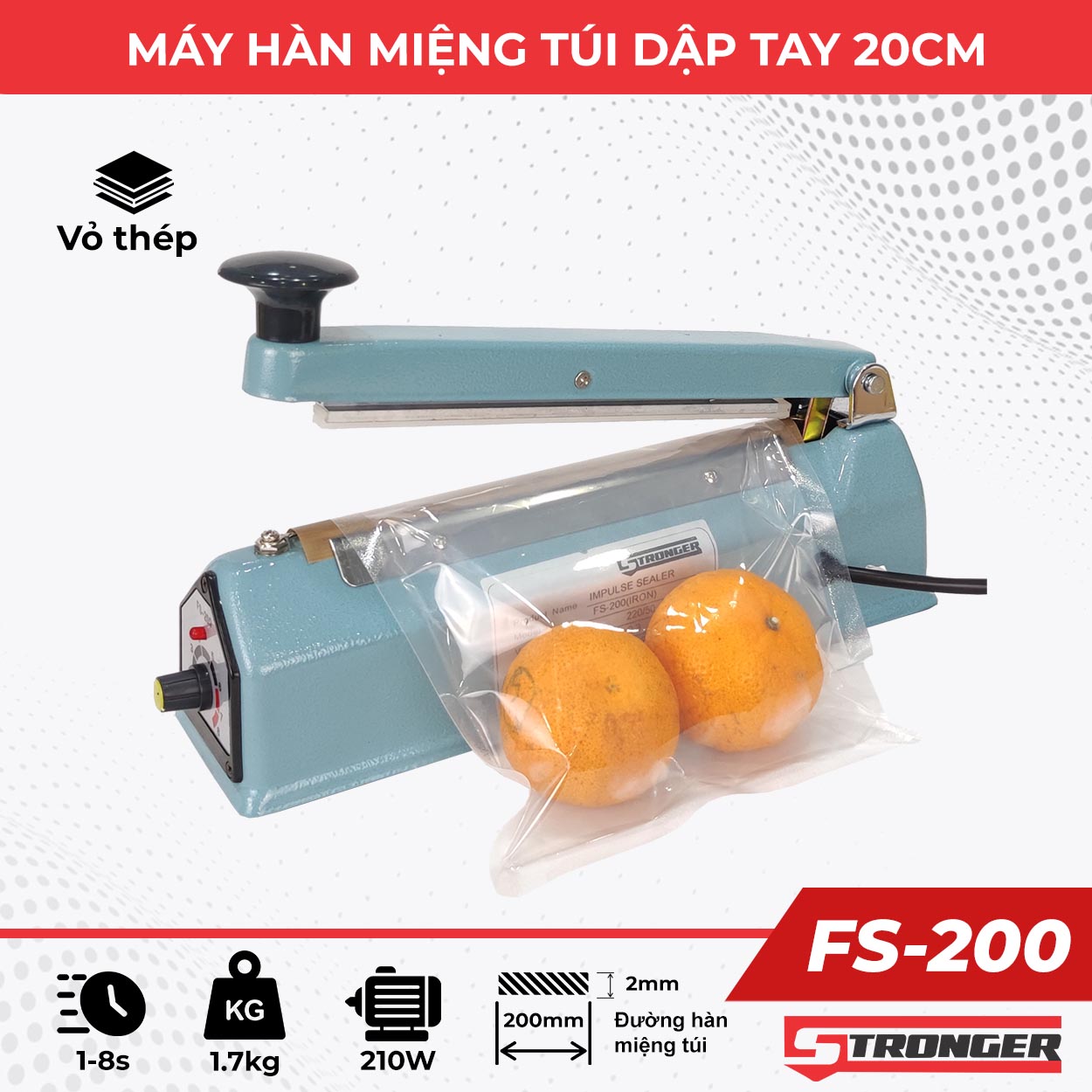 Máy hàn miệng túi mini dập tay STRONGER FS-200 vỏ thép được công ty Thiết bị M5s nhập khẩu trực tiếp nhập khẩu từ nhà sản xuất Hulian và phân phối tại thị trường Việt Nam. Nhãn hiệu Stronger này đã được M5s đăng ký bản quyền và bảo hộ thương hiệu tại Việt Nam.