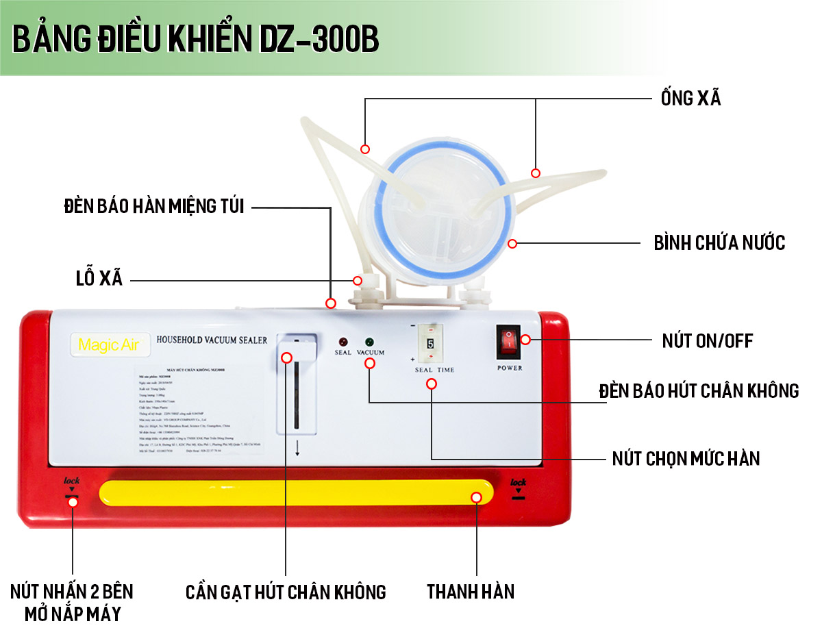 Các bộ phận của máy hút túi chân không gia đình DZ-300B có thể kể qua như: