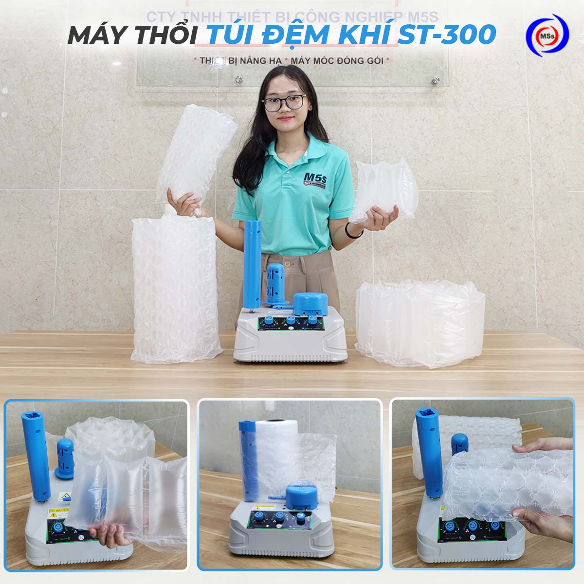 ST-300 cũng là một dòng máy thổi túi đệm khí tự động, sử dụng để chèn hàng. Thiết bị phù hợp với các loại túi dạng gối nhiều kích thước khác nhau.