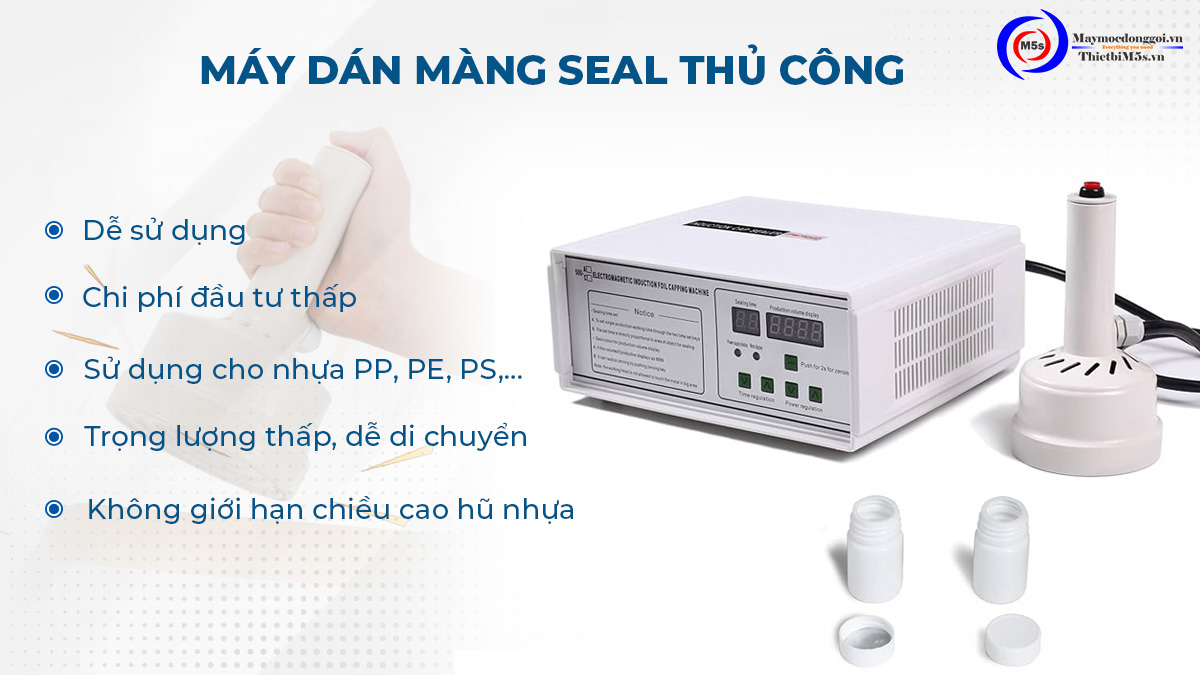 Máy dán màng seal thủ công là mã máy có bộ phận tay cầm seal. Để dán màng nhôm hũ nhựa người dùng phải đặt nó lên miệng nắp chai.
